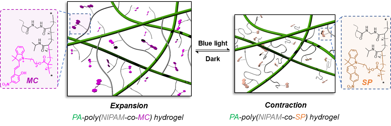 Nanofibers synthesized from self-assembling peptide amphiphiles (PAs) were combined with light-responsive spiropyran hydrogels to develop a supramolecular-covalent hybrid material that can transform its shape, rotate and crawl in response to changes in light conditions. Our model and simulations showed that the supramolecular structure act as a channel to drain water out of the hydrogel during light-activated actuation. Such draining in conjunction with the noncovalent distortions suggested by the simulations could enhance the speed and/or reversibility of photo-actuation.