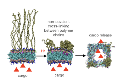 In a different project, we designed ultra-small polymer-grafted nanobins (usPGNs) for drug delivery applications that respond to change in pH with the use of the poly(acrylic acid) polymers grafted onto the liposome membrane. The grafted polymer design not only allows for the pH response but also enhances the stability of the vesicles with small hydrodynamic diameters (D < 50 nm), which is preferable for drug delivery to cells. An increase in pH as a result of crossing cell membranes triggers the polymer to collapse onto the vesicle and release its cargo through the holes that form in the membrane.